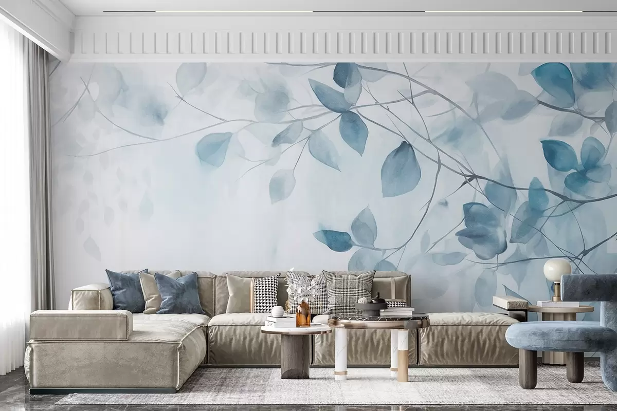 Fototapeta Teksturowy obraz akwarelowy imitujący niebieskie liście i gałęzie, miękkie kolory, delikatne detale na białym tle Nr w09133v1