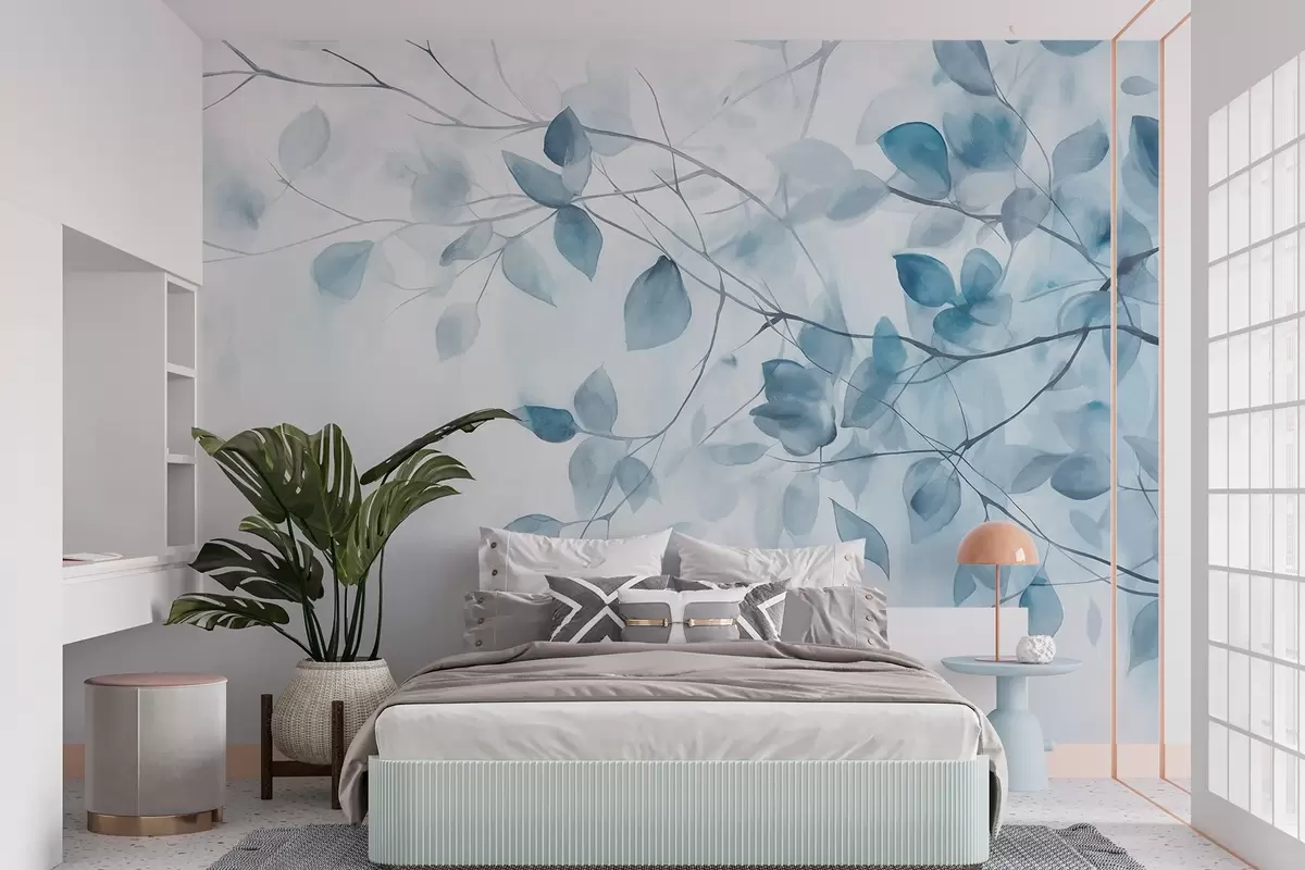 Fototapeta Teksturowy obraz akwarelowy imitujący niebieskie liście i gałęzie, miękkie kolory, delikatne detale na białym tle Nr w09133v1