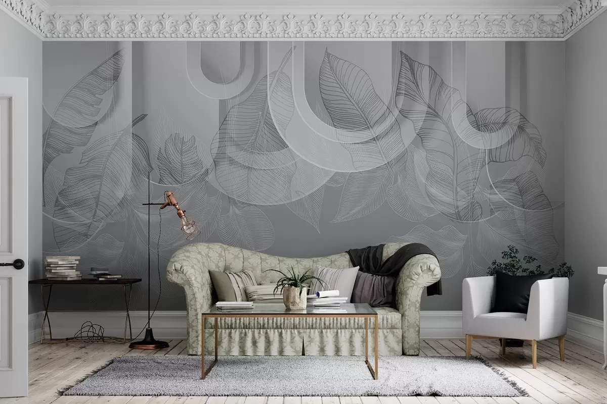 Fototapeta Abstrakcyjne tło z szarymi łukami i białymi tropikalnymi liśćmi, minimalistyczny design, elegancki i nowoczesny, neutralna paleta kolorów Nr w09138