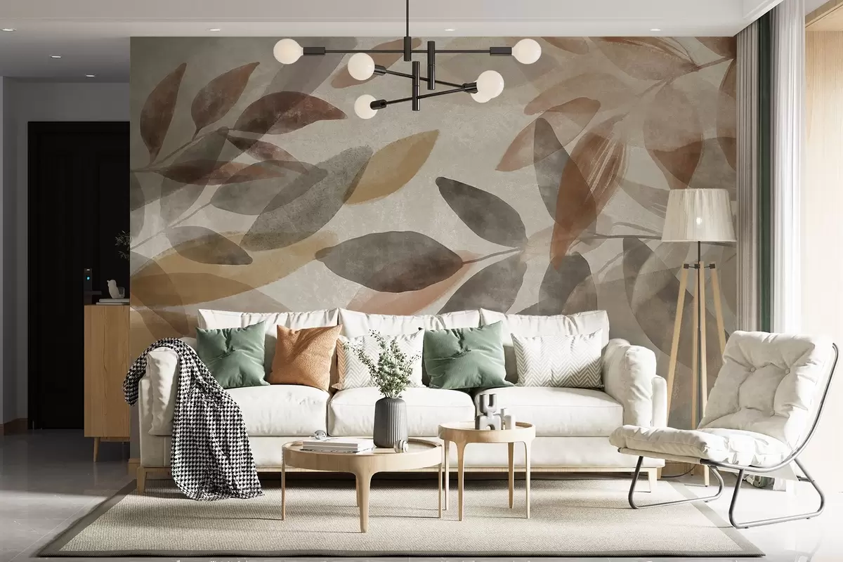 Fototapeta Abstrakcyjne teksturowane liście w stonowanych odcieniach brązu, beżu i szarości, przezroczyste kształty, minimalistyczny styl, organiczne kształty Nr w09140