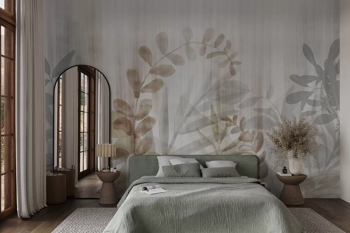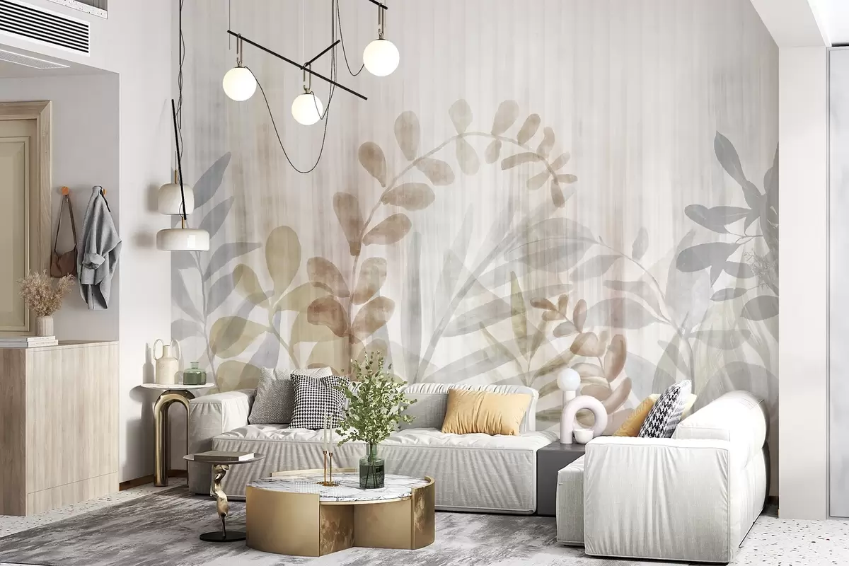 Fototapeta Obraz akwarelowy imitujący rośliny z wielokolorowymi stonowanymi liśćmi, jasne tło z pionowymi liniami, ilustracja botaniczna Nr w09146