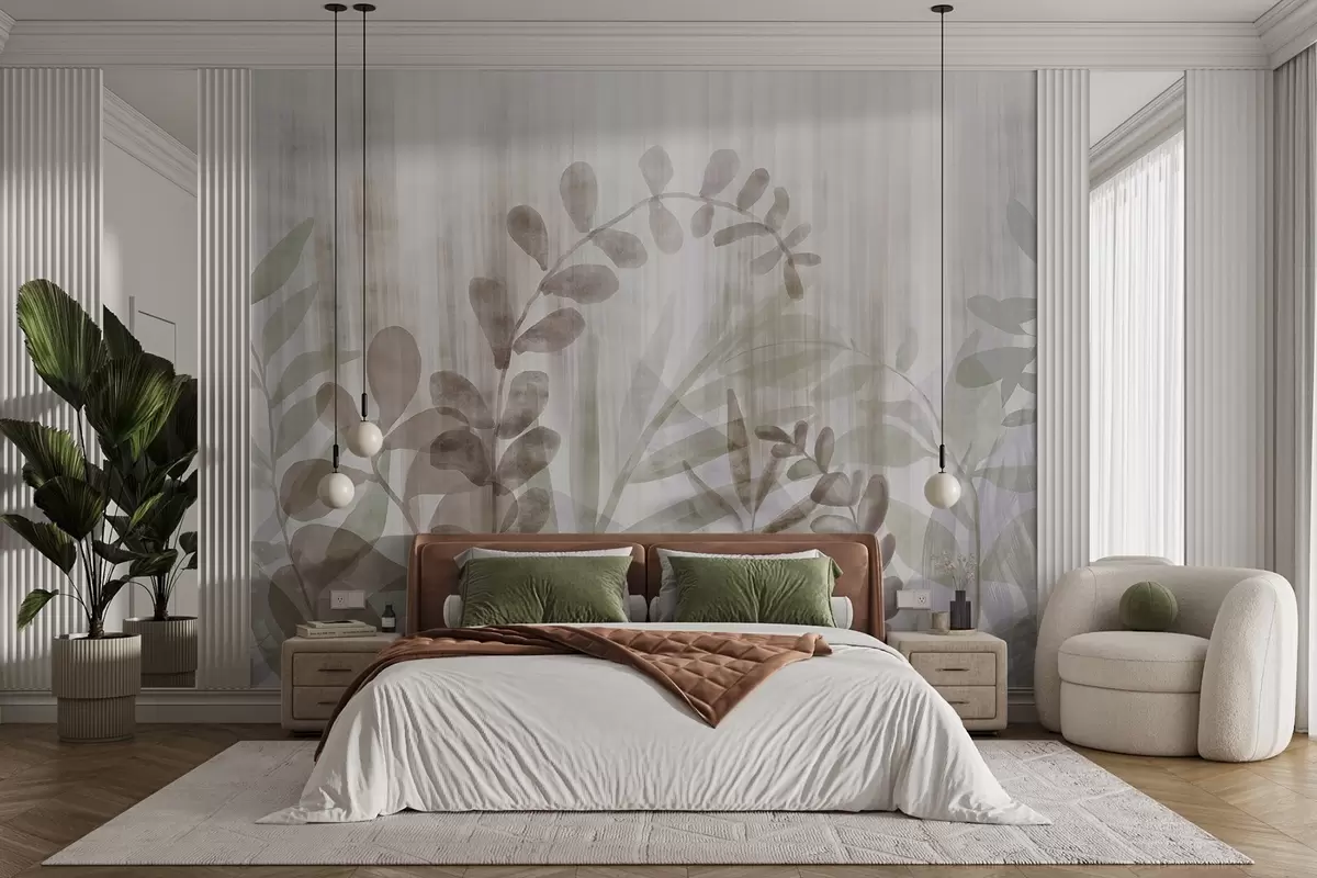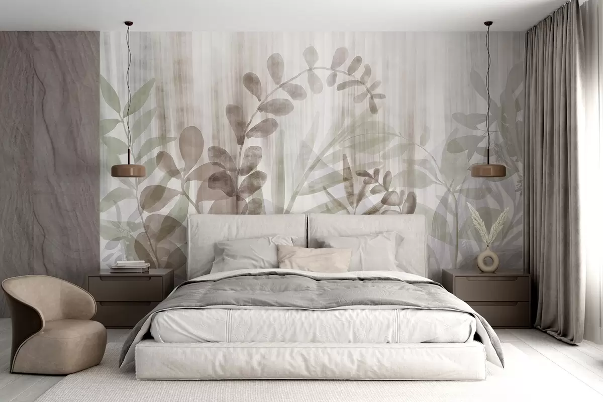 Fototapeta Obraz akwarelowy imitujący rośliny z wielokolorowymi stonowanymi liśćmi, jasne tło z pionowymi liniami, ilustracja botaniczna Nr w09146v1
