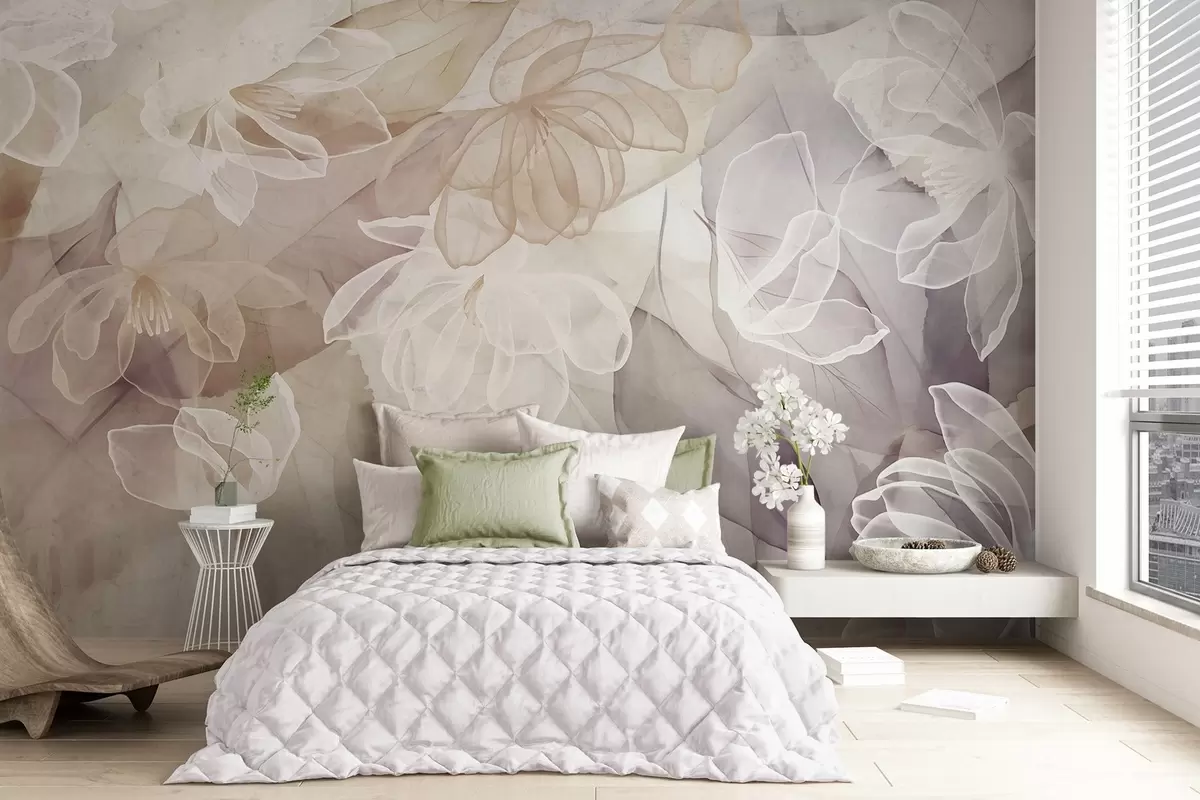 Fototapeta Kwiaty i liście o przezroczystych płatkach w odcieniach bieli, beżu i fioletu, miękkie i delikatne Nr w09158