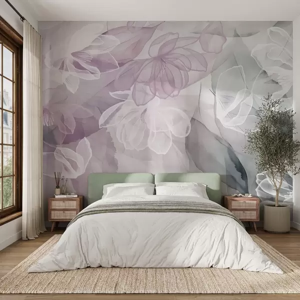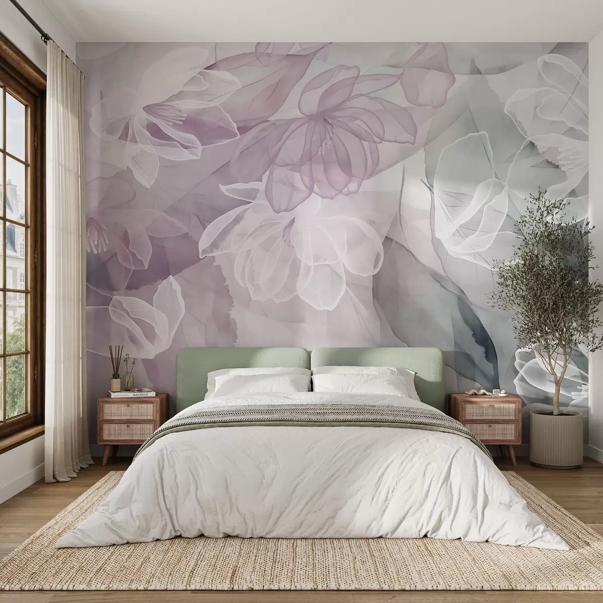 Fototapeta Kwiaty i liście o przezroczystych płatkach w odcieniach bieli, różu i zieleni, miękkie i delikatne Nr w09158v1