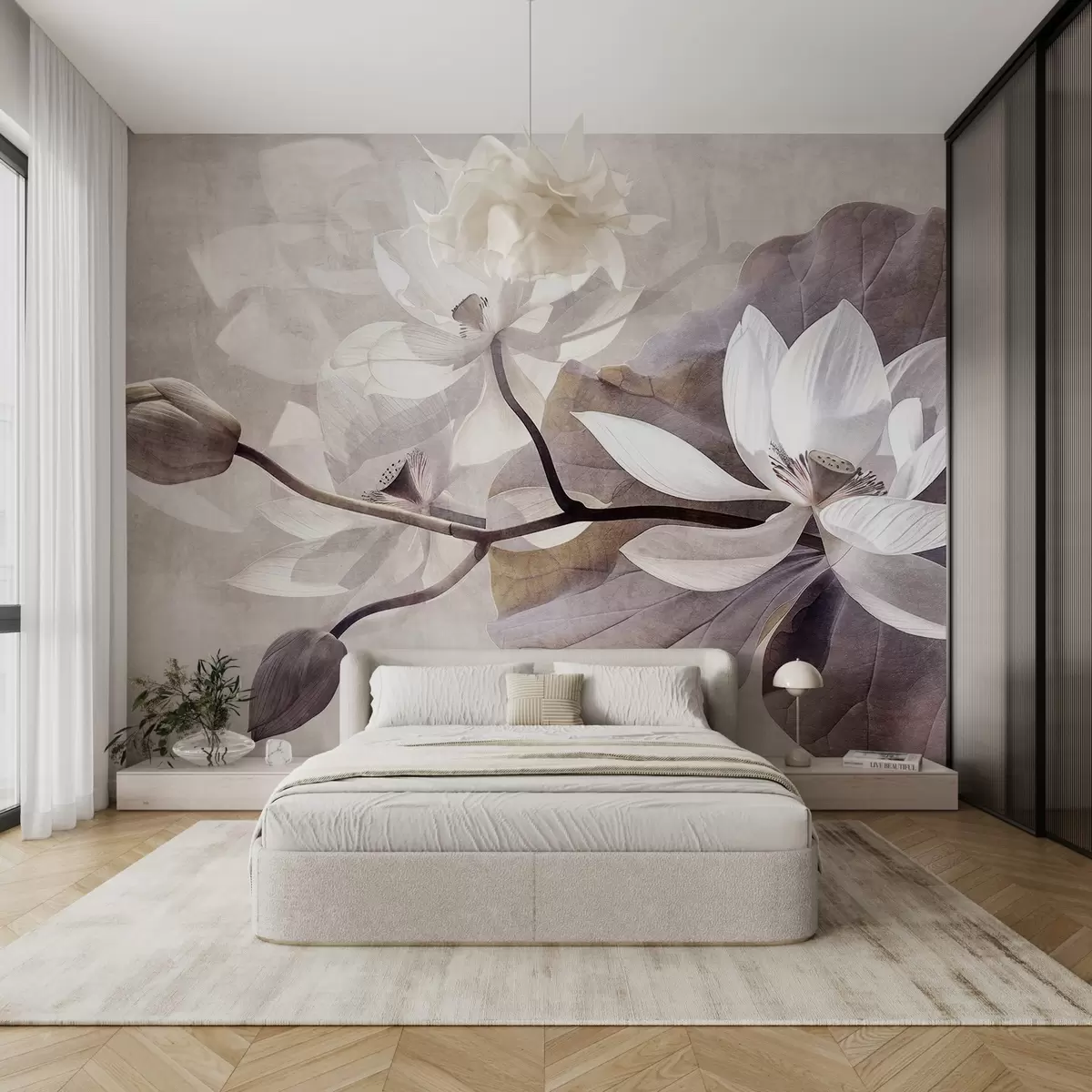 Fototapeta Ziarniste, stonowane, delikatne kwiaty lotosu z liśćmi i łodygami w miękkiej, beżowej palecie kolorów Nr w09159