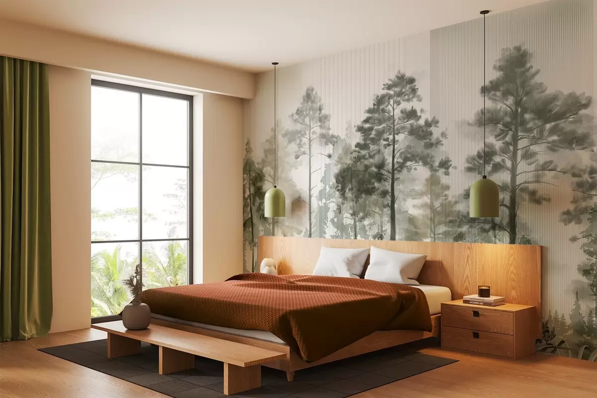 Fototapeta Gęsty las z wysokimi sosnami, bujne zielone liście, mglista atmosfera z pionowymi liniami tekstur Nr w09163