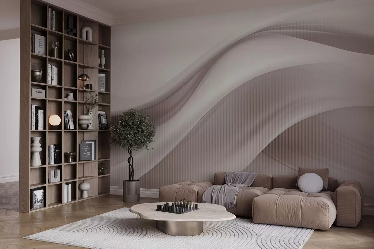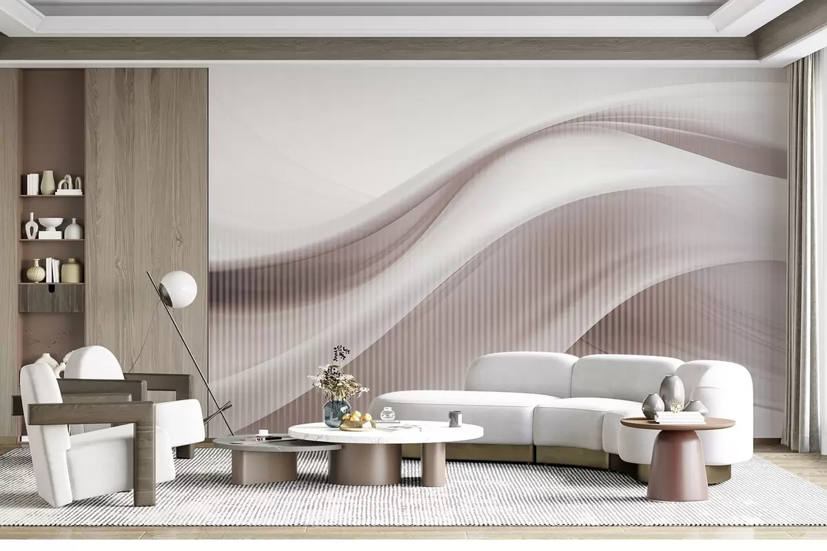 Fototapeta Abstrakcyjny nadruk z płynnymi liniami i subtelnymi pionowymi paskami, tworzący poczucie ruchu i głębi, paleta beżowa Nr w09189