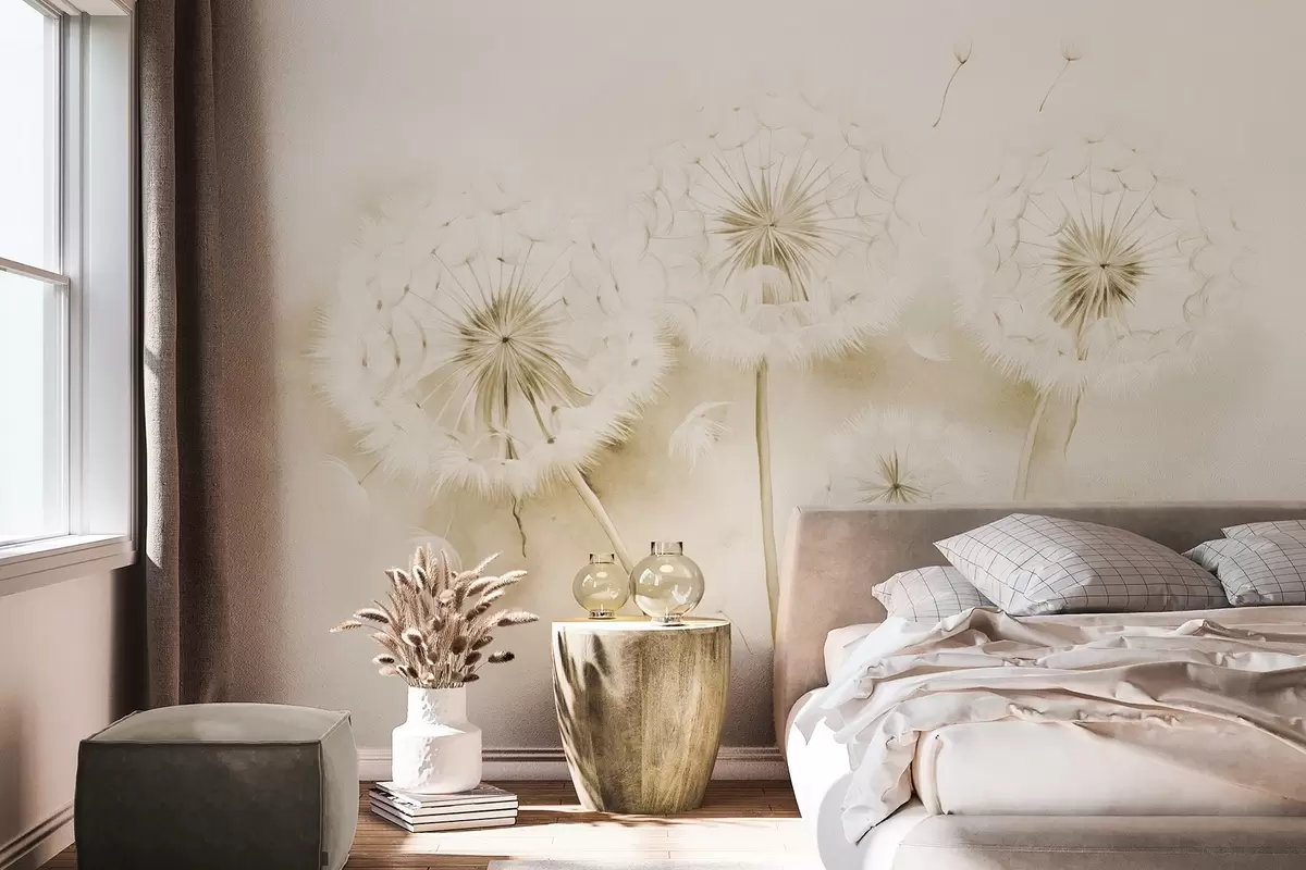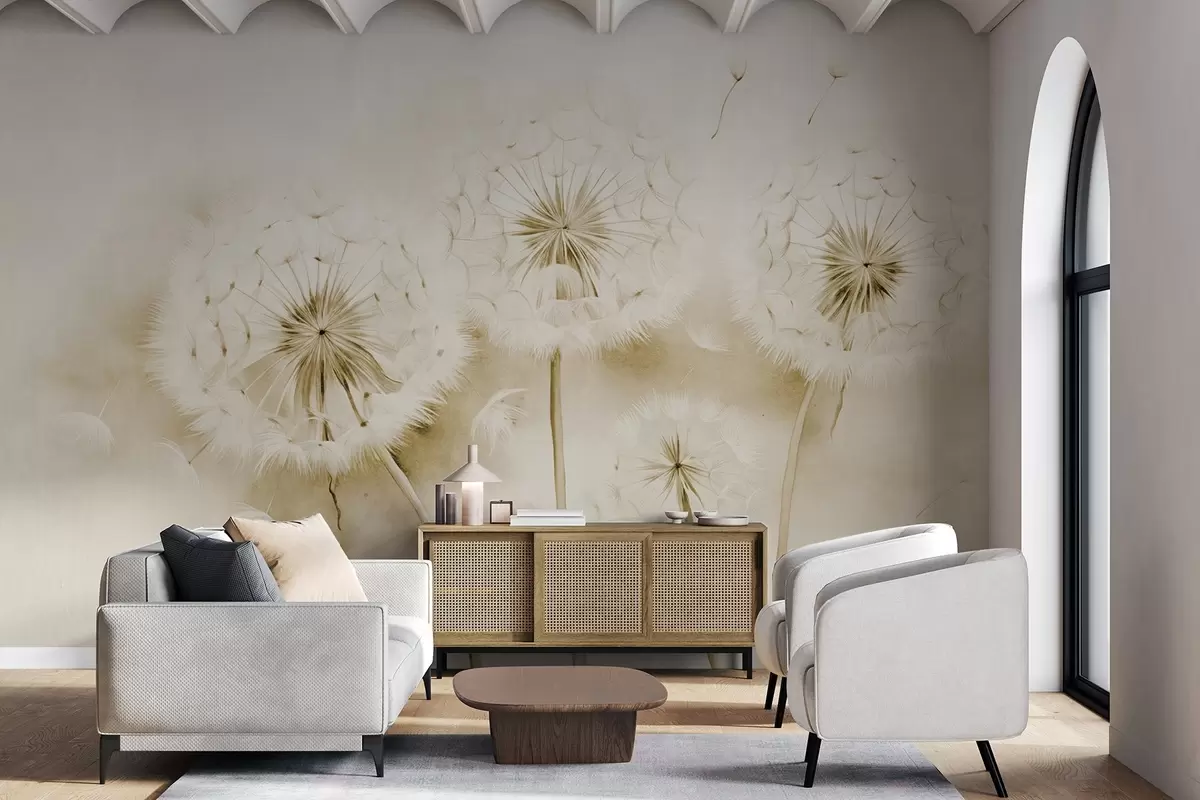 Fototapeta Teksturowane mlecze z nasionami unoszącymi się w powietrzu, stonowane żółte i białe tło, miękki delikatny styl rysowania Nr w09190v1