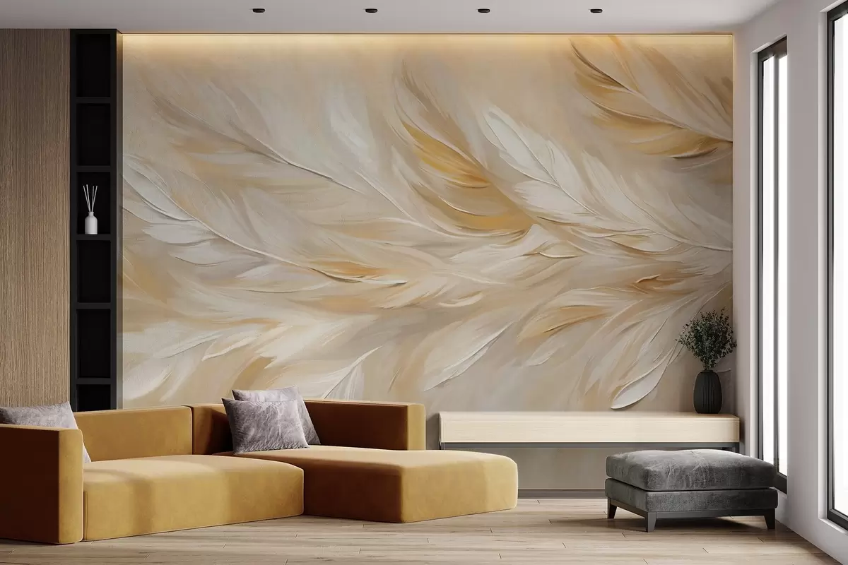 Fototapeta Białe i beżowe pióra ułożone w płynny nadruk, miękka tekstura, ciepła paleta kolorów, abstrakcyjne tło Nr w09191