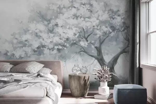 Fototapeta Abstrakcyjne stonowane niebieskie kwitnące drzewo obok rzeki, miękkie teksturowane pociągnięcia pędzla i pastelowe kolory Nr w09193v2