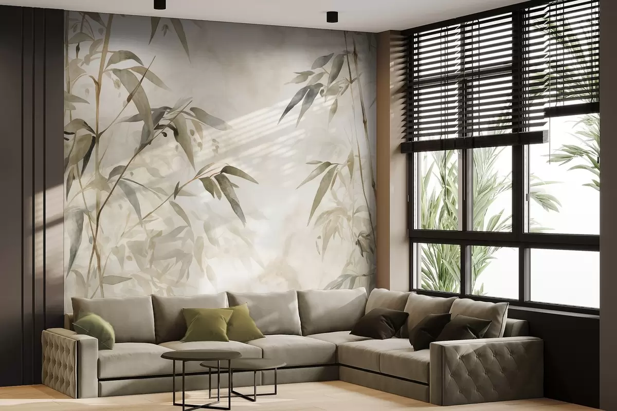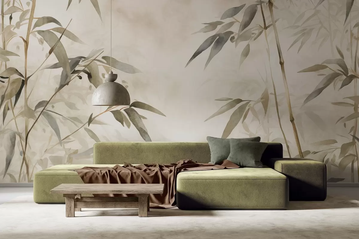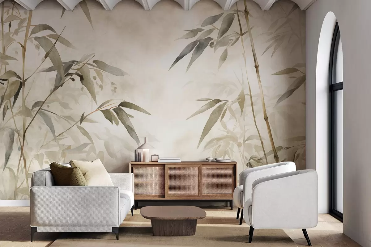Fototapeta Bambusowe teksturowane gałęzie z liśćmi w stylu akwareli, miękka neutralna paleta kolorów, jasnobeżowe tło Nr w09204