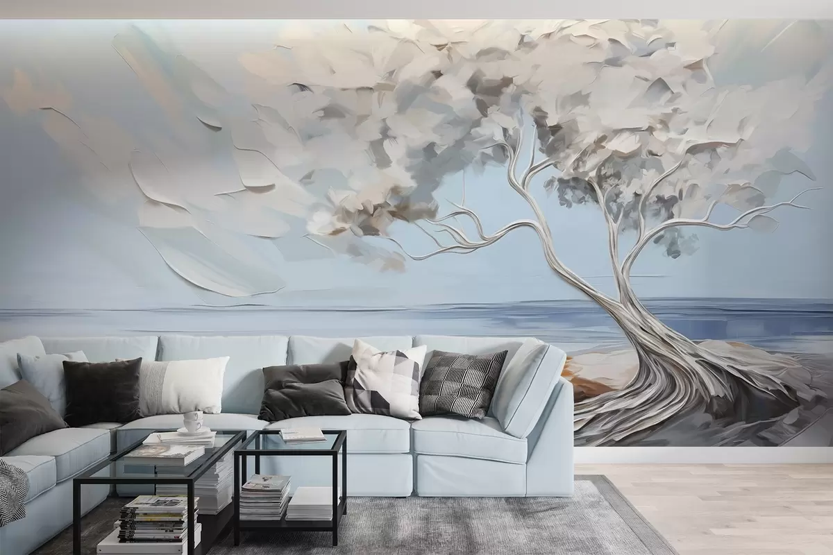 Fototapeta Białe drzewo z grubymi i teksturowanymi liśćmi na piaszczystej plaży, krajobraz z jasnoniebieskim niebem Nr w09205