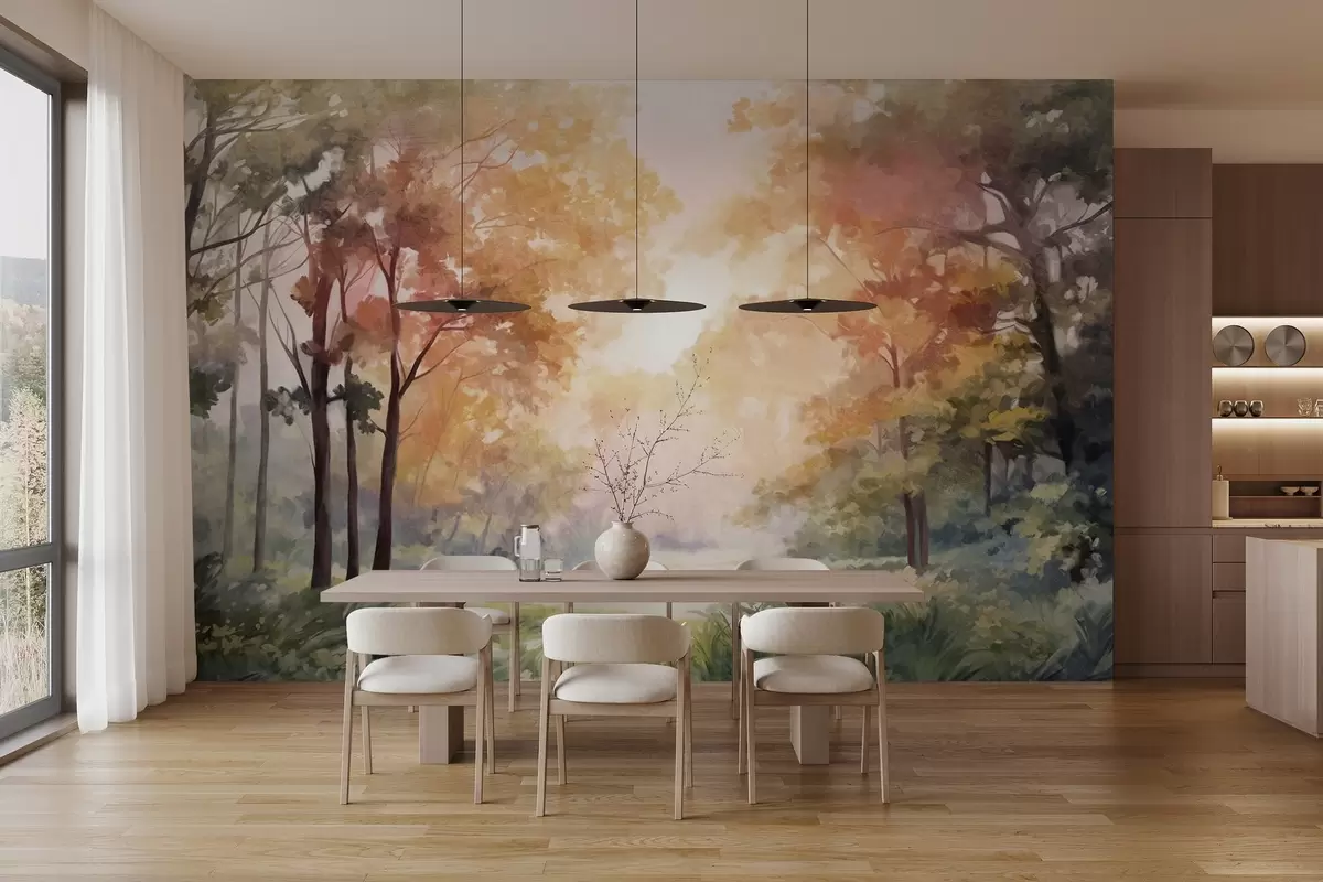 Fototapeta Teksturowany krajobraz leśny, drzewa z pomarańczowymi i zielonymi liśćmi, pastelowa paleta kolorów Nr w09210v1