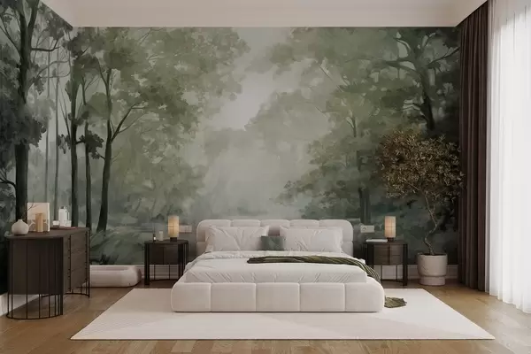 Fototapeta Teksturowany krajobraz leśny, drzewa z zielonymi liśćmi, pastelowa paleta kolorów Nr w09210v2