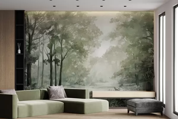 Fototapeta Teksturowany krajobraz leśny, drzewa z zielonymi liśćmi, pastelowa paleta kolorów Nr w09210v2