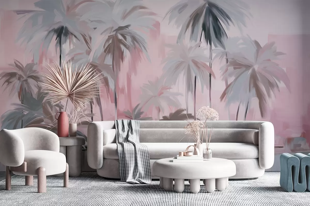 Fototapeta Abstrakcyjne minimalistyczne pastelowe palmy tropikalne na tle stonowanych odcieni różu i szarości Nr w09212v1