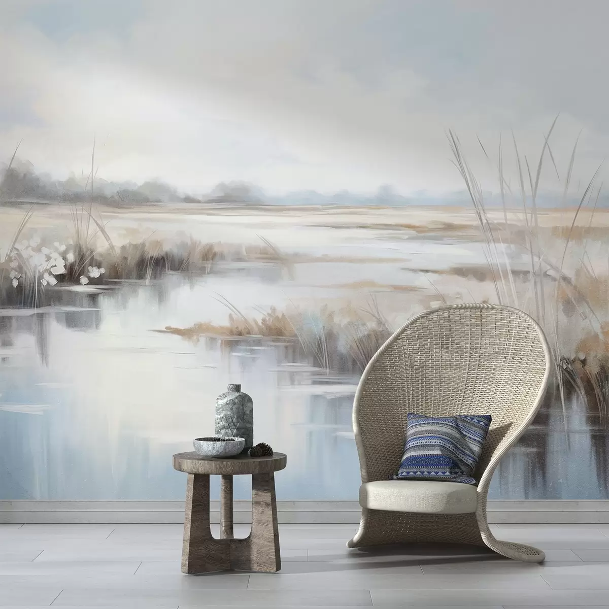 Fototapeta Teksturowany spokojny krajobraz z wysokimi trawami i spokojną wodą, delikatne pastelowe kolory, odległe drzewa na horyzoncie Nr w09213