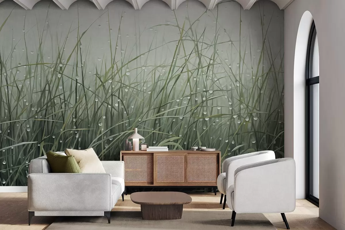 Fototapeta Trawa z kroplami wody, stonowane odcienie zieleni, miękkie światło, mgliste tło, abstrakcyjny minimalistyczny styl teksturowany Nr w09217