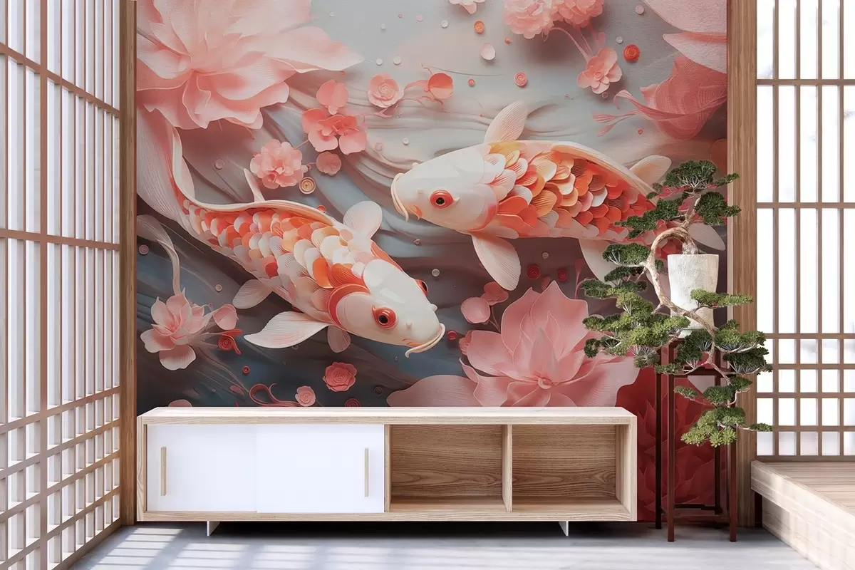 Fototapeta Delikatne ryby z wymiarowymi łuskami przepływają przez strumień płatków i delikatne różowe odcienie Nr w09237