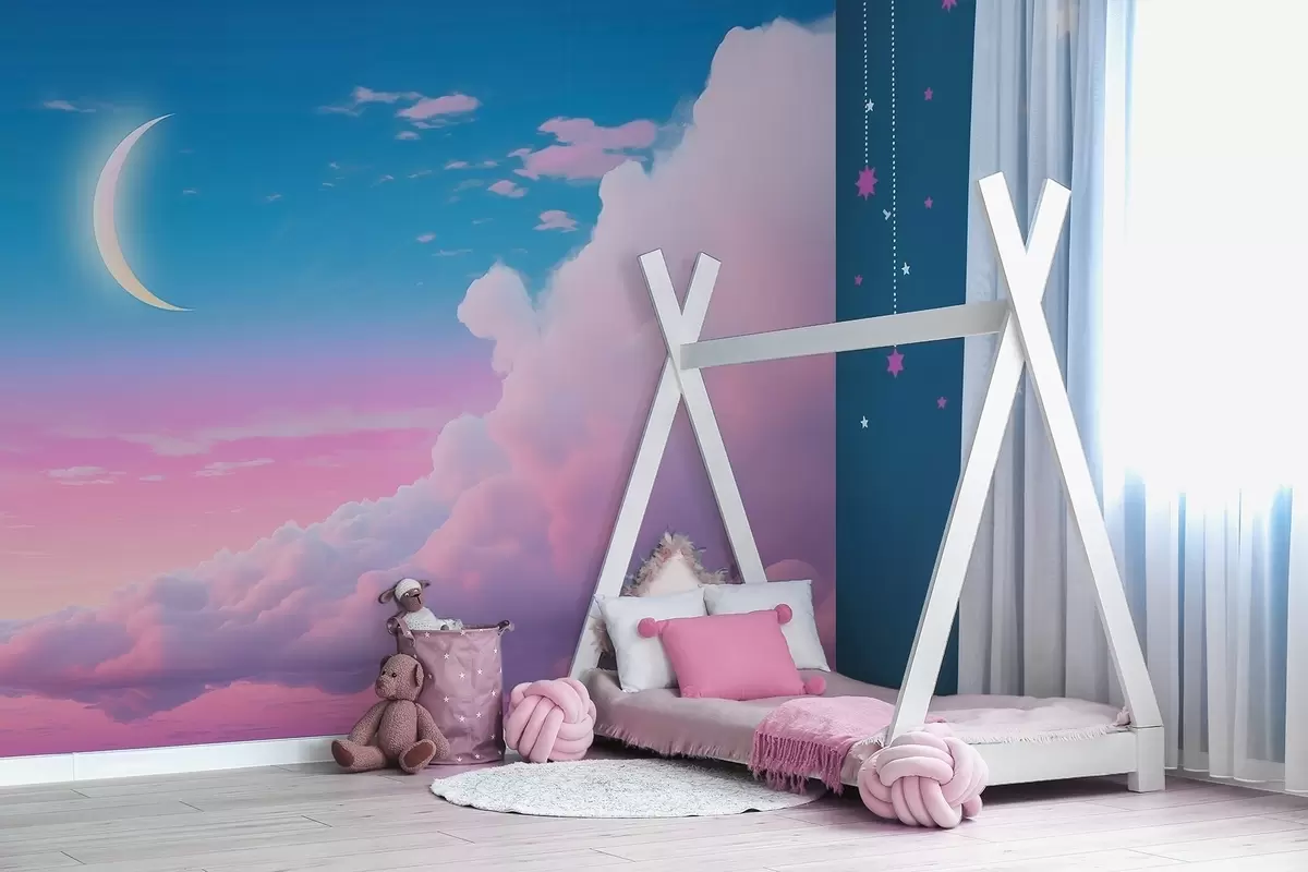 Fototapeta Magiczny zachód słońca z chmurami i półksiężycem w różowych i niebieskich odcieniach Nr w09240