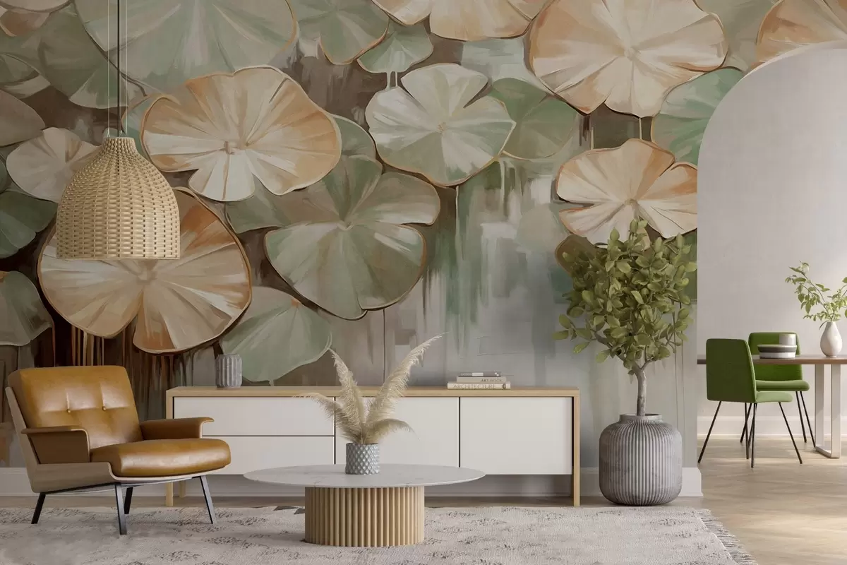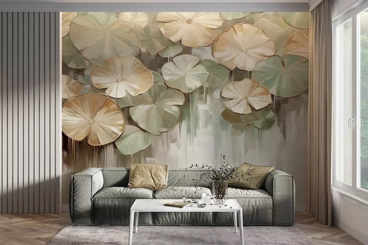 Fototapeta Teksturowane płatki lilii w zielonych i beżowych kolorach w stawie, tło jest rozmytą mieszanką bieli, zieleni i brązu Nr w09255