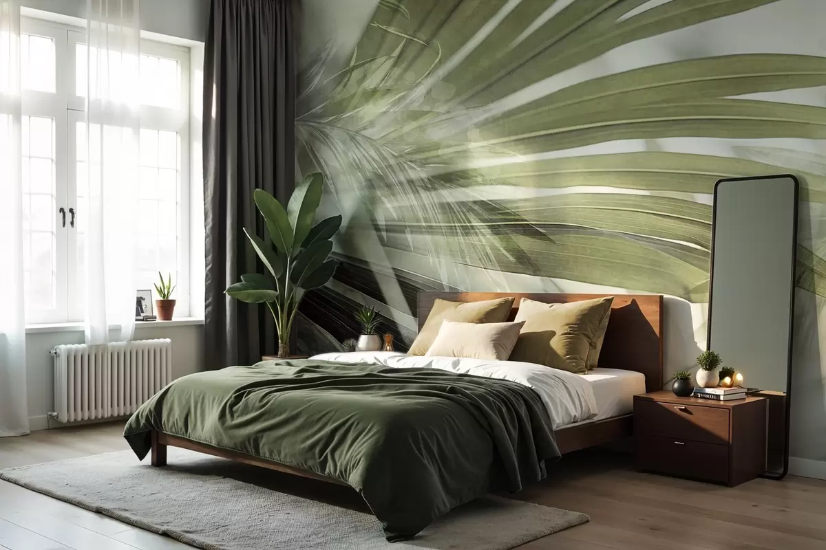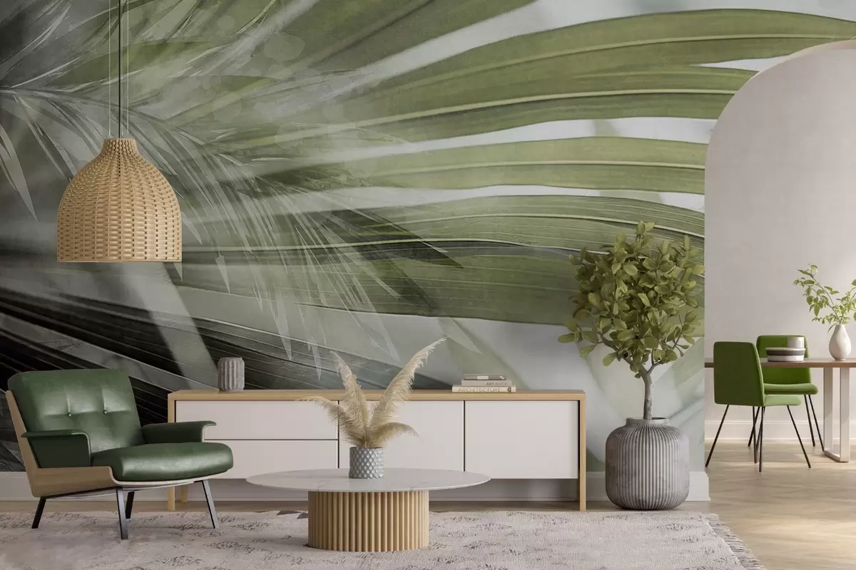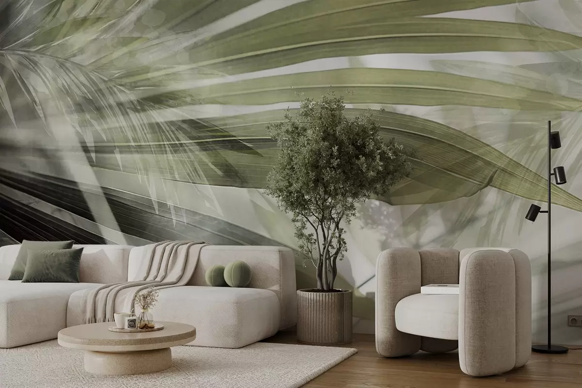 Fototapeta Liście palmowe o jasnozielonym odcieniu, nakładające się na siebie i tworzące efekt warstwowy, na miękkim, neutralnym tle Nr w09256v1