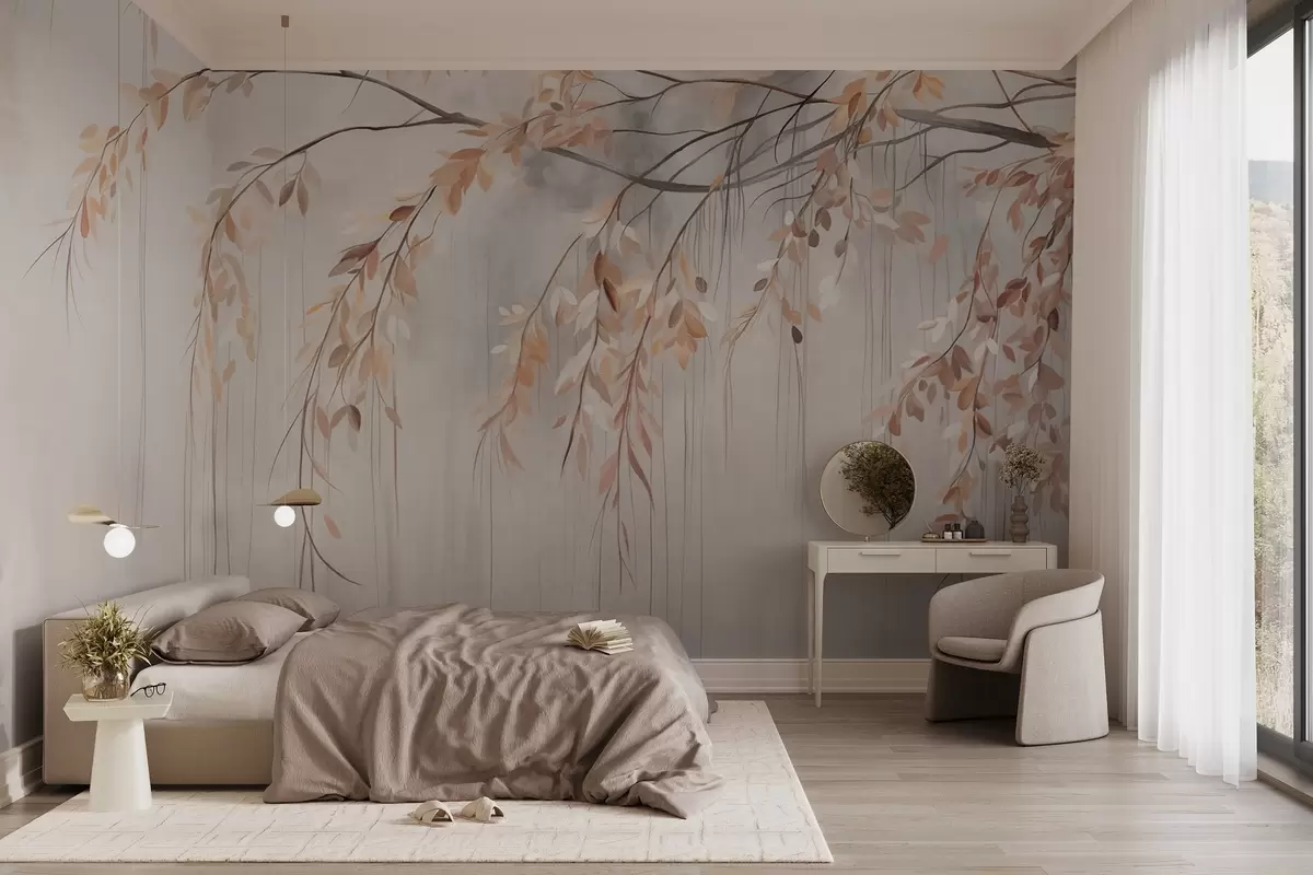 Fototapeta Gałąź z jasnopomarańczowymi liśćmi zwisającymi w dół, jasnoszare teksturowane rozmyte tło, miękki i delikatny styl Nr w09265