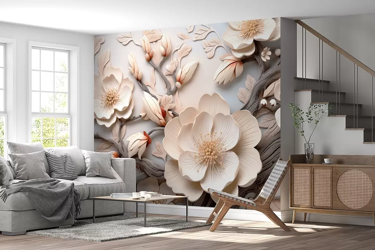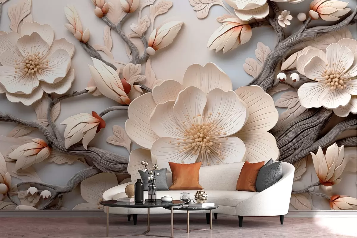 Fototapeta Wolumetryczne kwiaty i gałęzie w jasnych odcieniach Nr w09272
