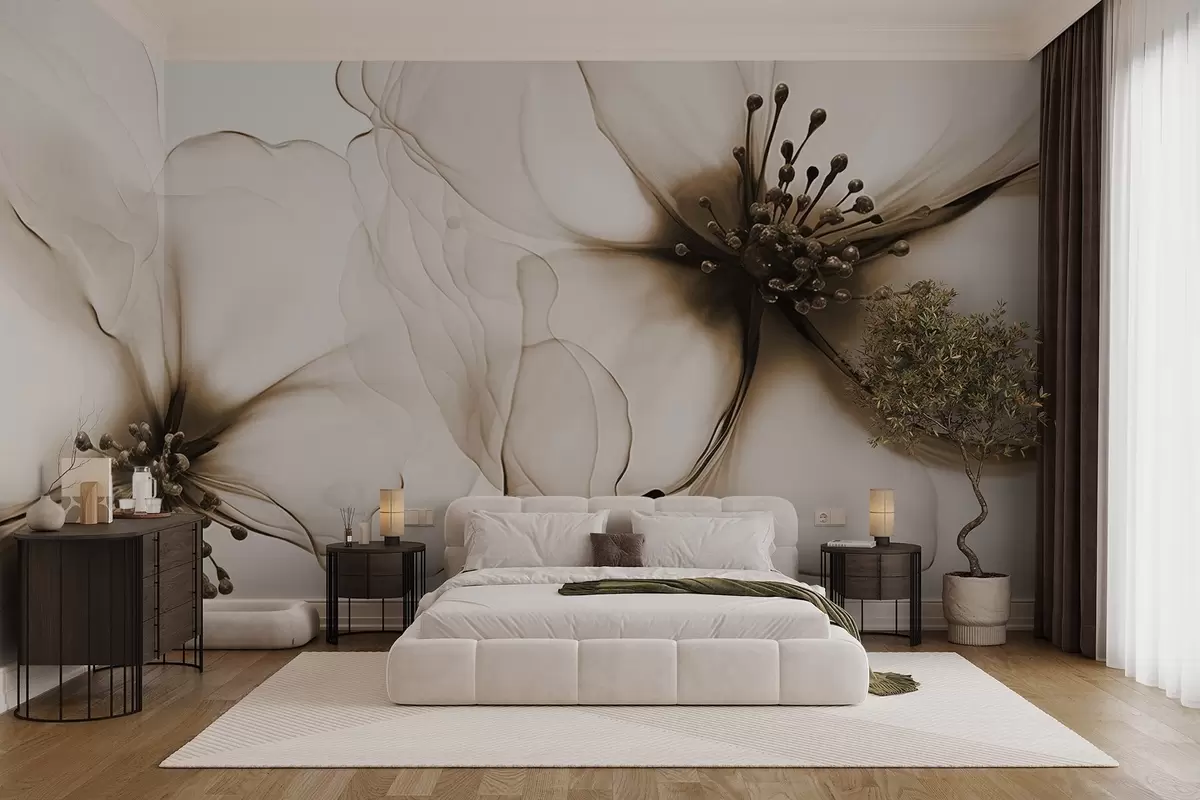 Fototapeta Dwa półprzezroczyste, teksturowane brązowe kwiaty z widocznymi pręcikami, zachodzącymi na siebie delikatnymi płatkami i miękką, płynną teksturą Nr w09295