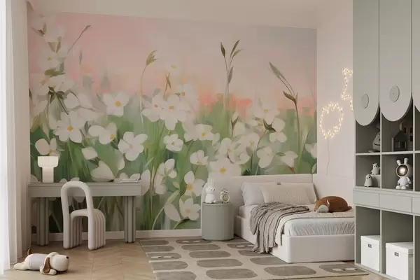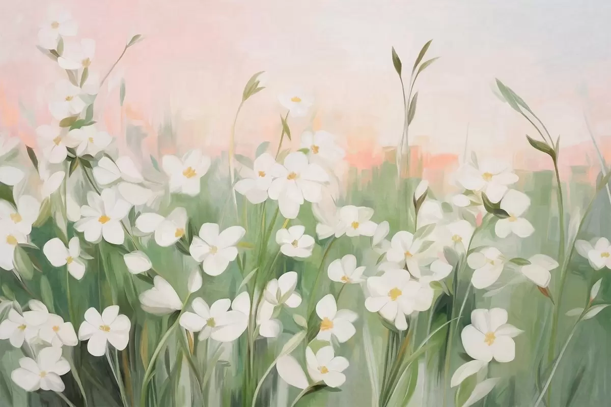 Fototapeta Abstrakcyjne pole dzikich kwiatów z zielonymi łodygami i liśćmi na tle delikatnego różowo-białego nieba o fakturze. Nr w09297