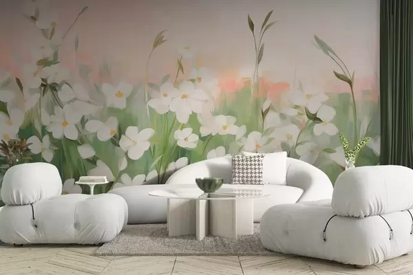 Fototapeta Abstrakcyjne pole dzikich kwiatów z zielonymi łodygami i liśćmi na tle delikatnego różowo-białego nieba o fakturze. Nr w09297