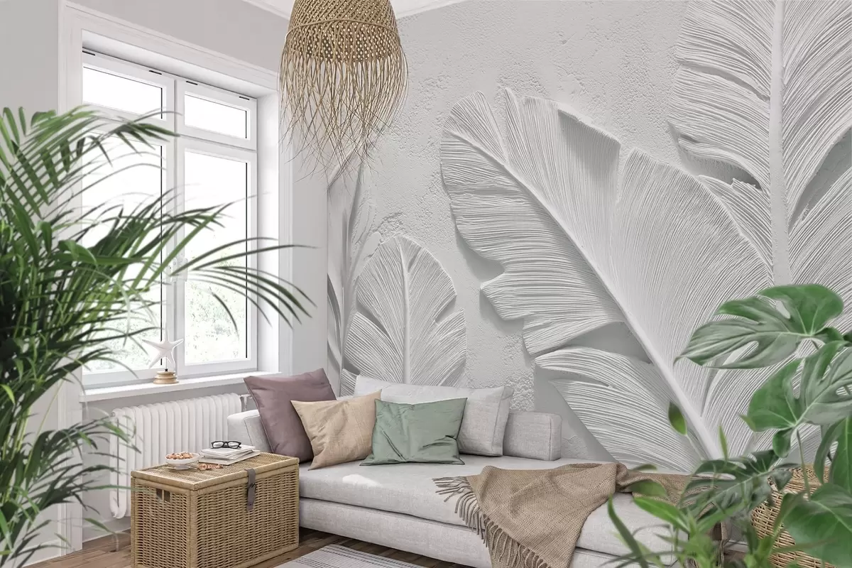 Fototapeta Teksturowane szare liście na tle z reliefem ze sztucznego gipsu Nr w09307
