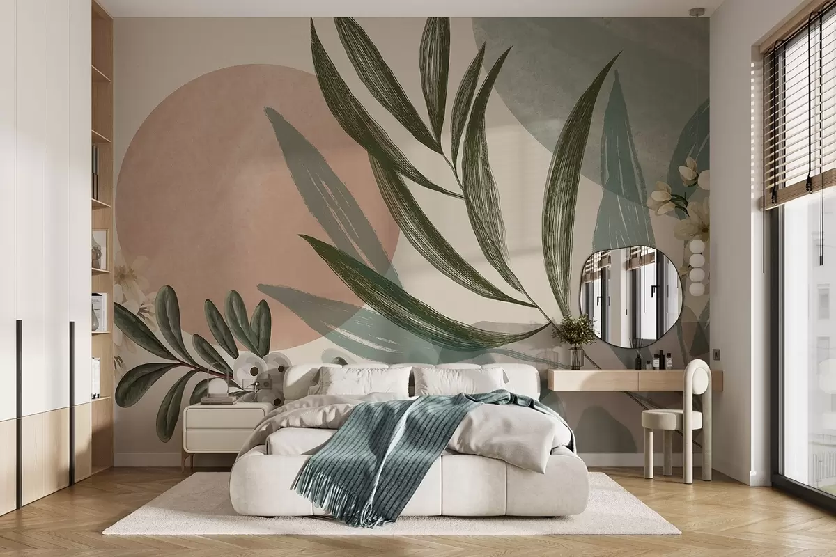 Fototapeta Abstrakcyjna grafika botaniczna z zielonymi liśćmi palmowymi i białymi jagodami na tle kształtów w stonowanych kolorach ziemi Nr w09312