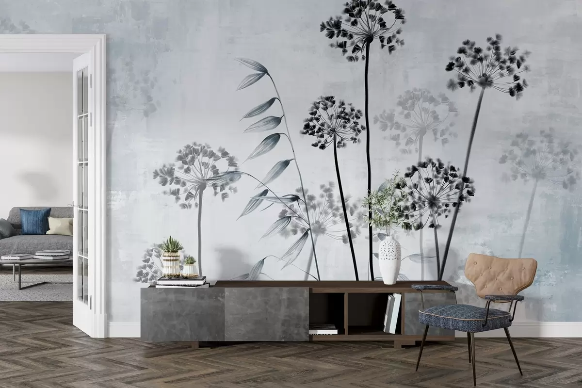 Fototapeta Rysunek suszonych kwiatów z długimi łodygami, monochromatyczna paleta, na teksturowanym, jasnoszarym tle, ilustracja botaniczna Nr w09314