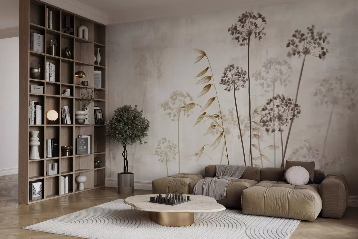 Fototapeta Rysunek suszonych kwiatów z długimi łodygami, monochromatyczna paleta, na teksturowanym, jasnobeżowym tle, ilustracja botaniczna Nr w09314v1
