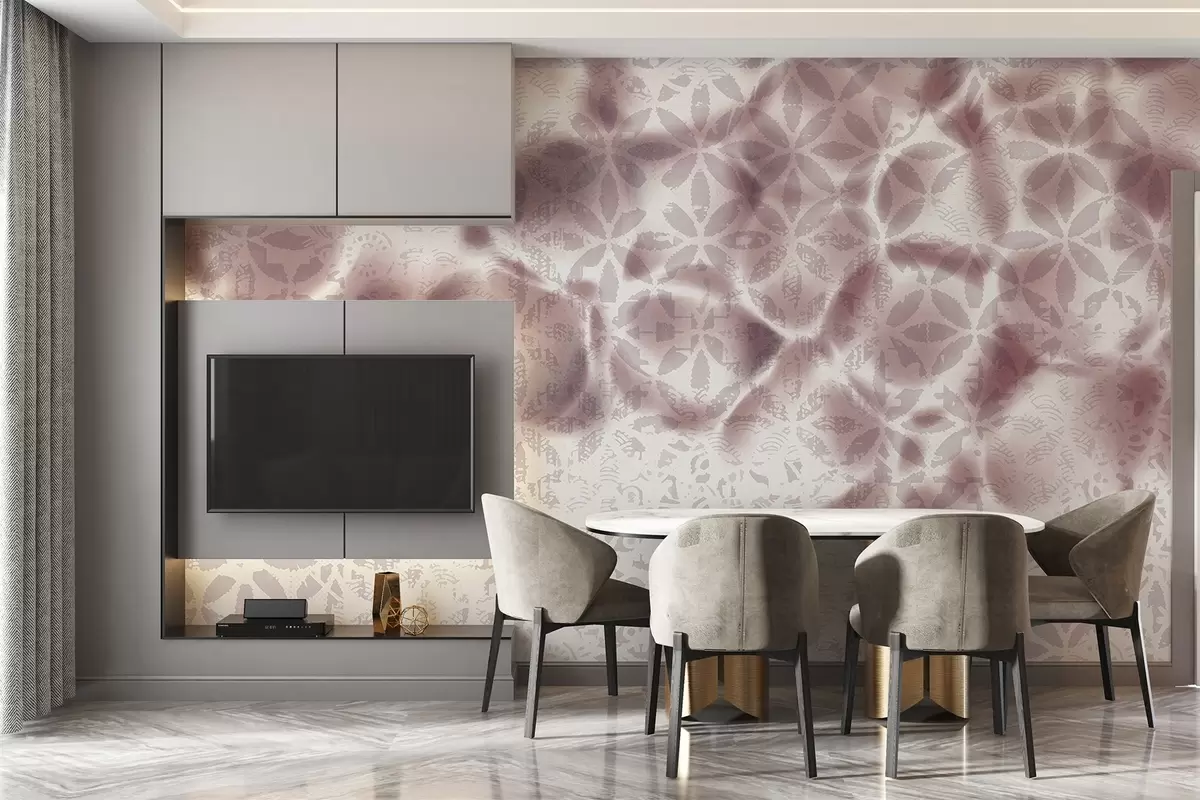 Fototapeta Abstrakcyjna teksturowana grafika z kwiatowym nadrukiem bordo, wyblakłym i rozmytym efektem, tworzącym miękką i marzycielską atmosferę Nr w09322v1