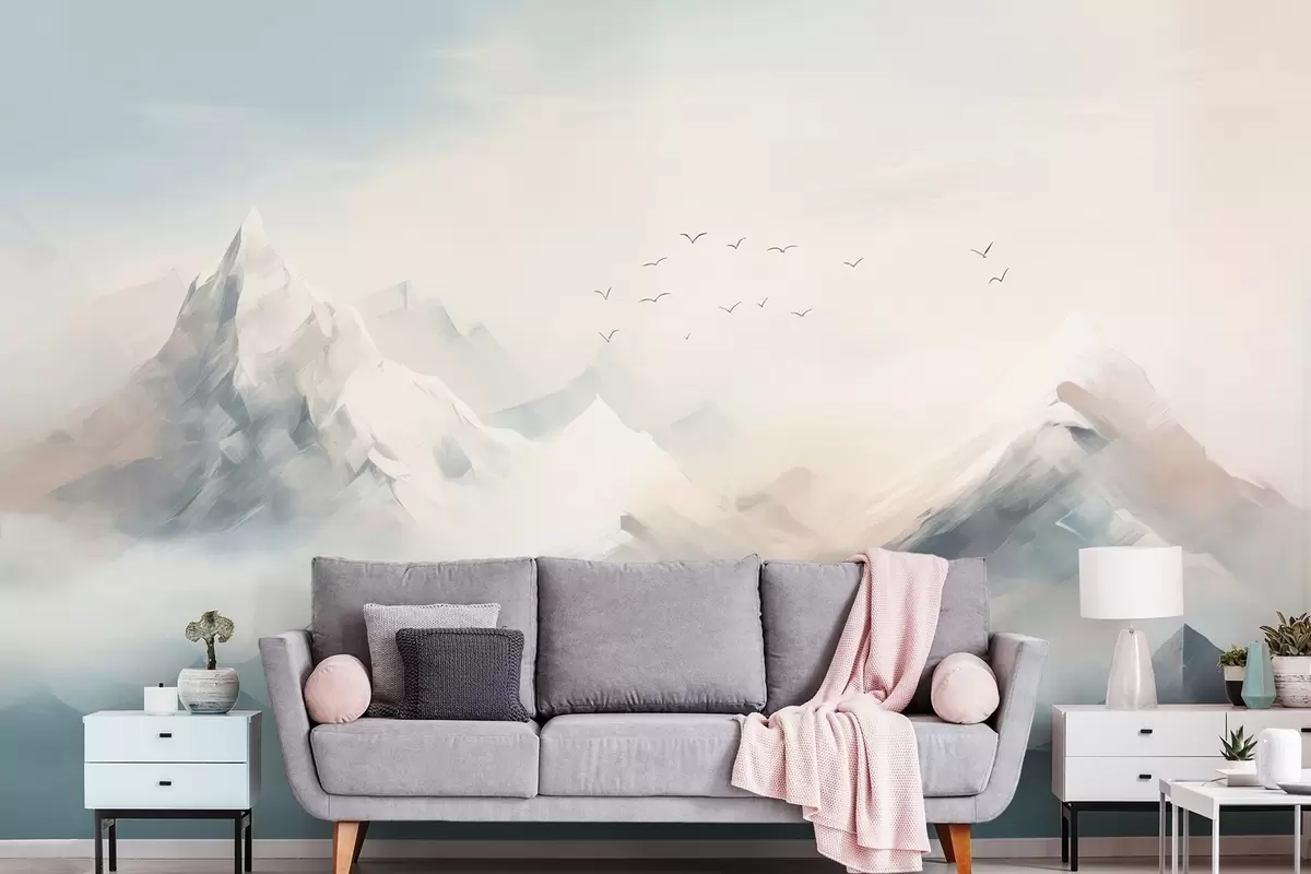 Fototapeta Ośnieżone szczyty górskie w porannej mgle z szybującymi ptakami Nr w09326