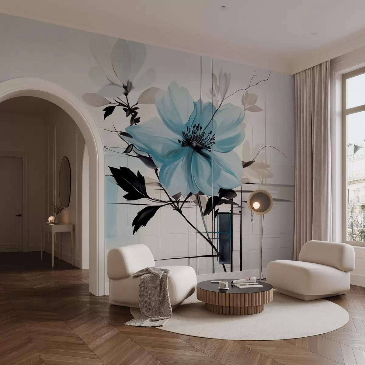 Fototapeta Abstrakcyjny teksturowany niebieski kwiat z ciemnymi liśćmi i gałęziami, geometryczne minimalistyczne kształty i linie w stonowanych kolorach Nr w09332