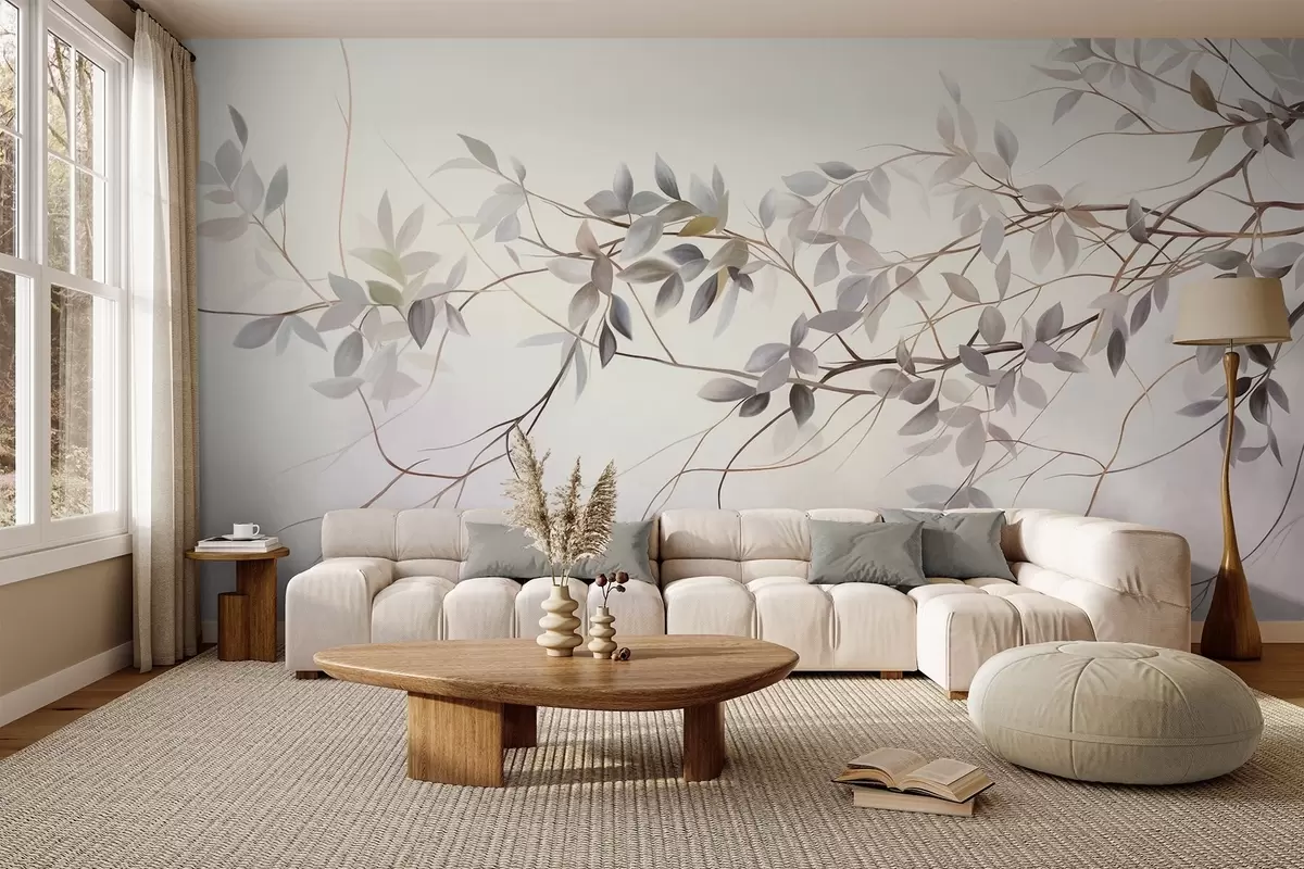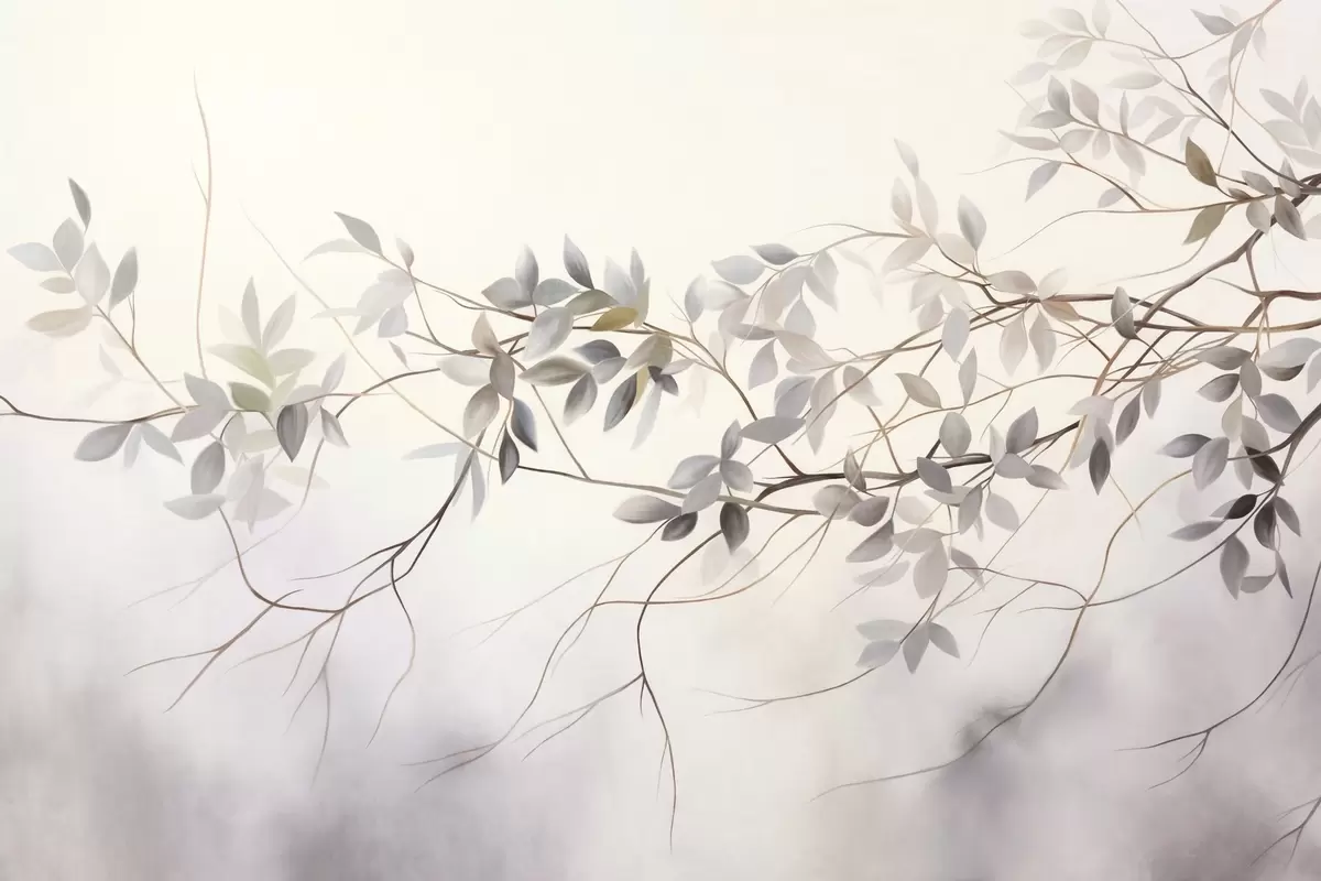 Fototapeta Delikatne gałęzie o fakturze z przytłumionymi szarymi, fioletowymi i zielonymi liśćmi na miękkim, zamazanym tle. Nr w09336