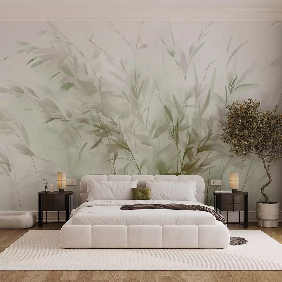 Fototapeta Trawa i chwasty z cienkimi liśćmi i łodygami, jasnozielone i brązowe kolory, miękkie i delikatne pociągnięcia pędzla, minimalistyczny nadruk Nr w09342