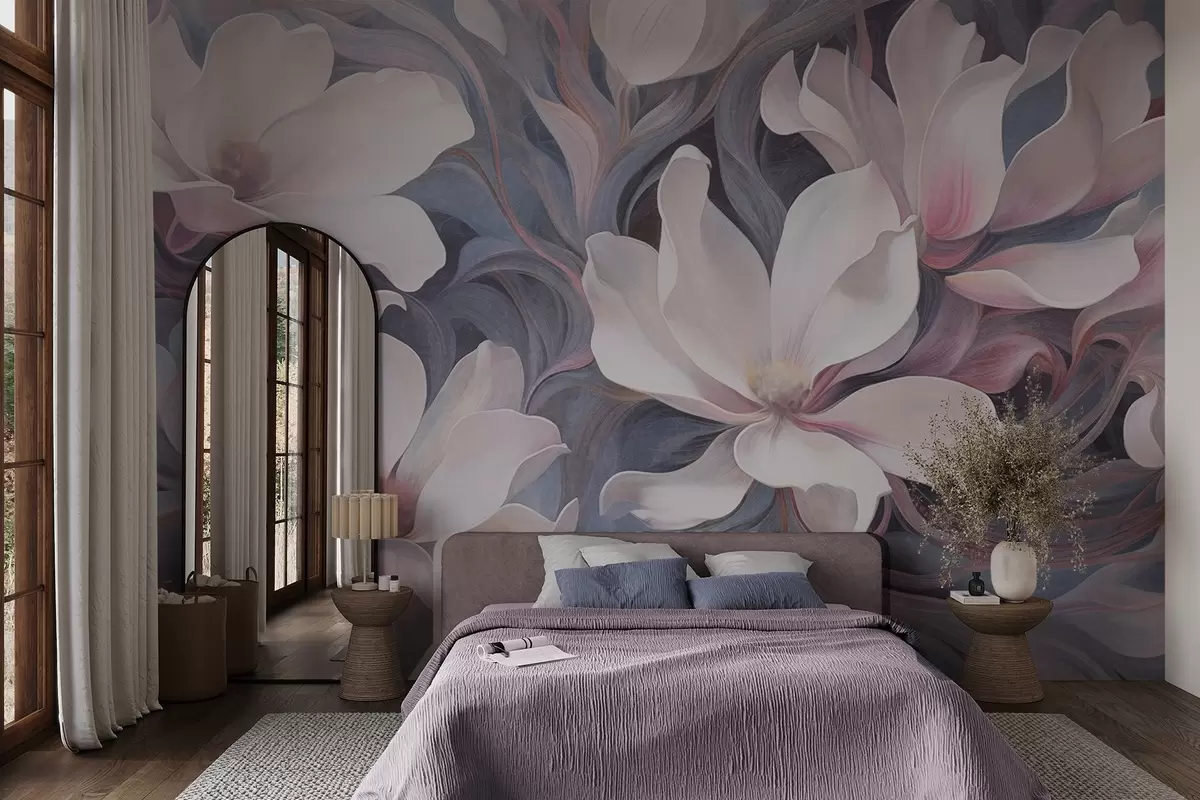 Fototapeta Teksturowany obraz białych kwiatów magnolii z różowymi akcentami na tle wirujących, stonowanych odcieni błękitu i szarości Nr w09344