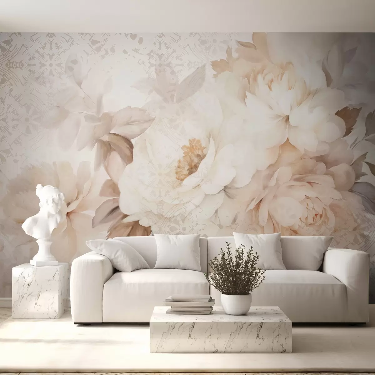 Fototapeta Kompozycja kwiatowa z białych piwonii z beżowymi liśćmi, na dekoracyjnym tle z teksturą w stylu vintage Nr w09345