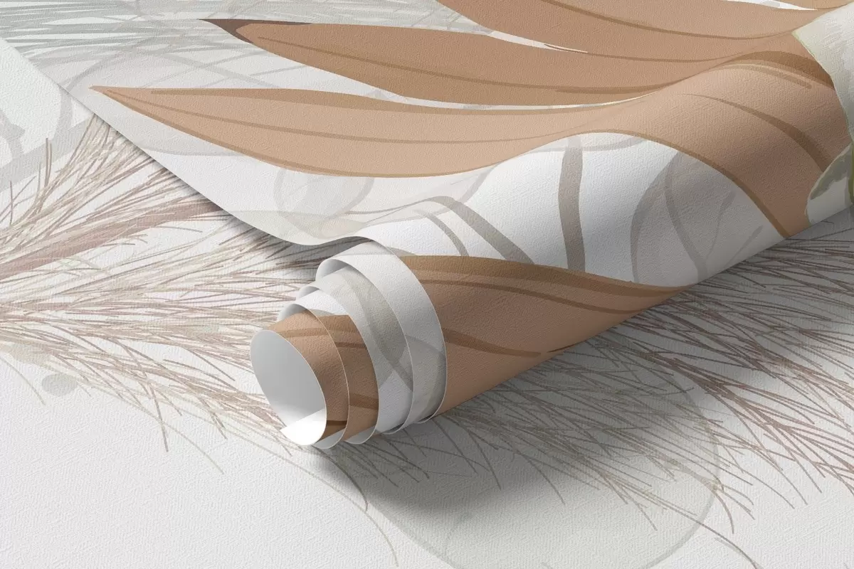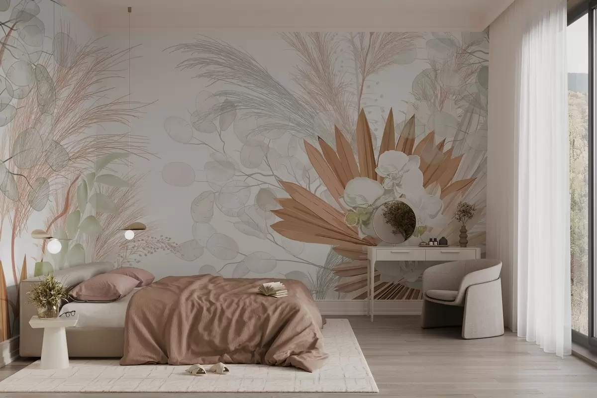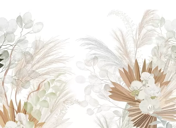 Fototapeta Trawa pampasowa, eukaliptus, tropikalne liście i orchidee na białym tle, pastelowe kolory Nr w09366