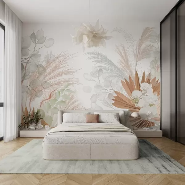Fototapeta Trawa pampasowa, eukaliptus, tropikalne liście i orchidee na białym tle, pastelowe kolory Nr w09366