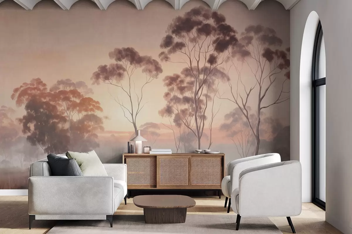 Fototapeta Pejzaż z drzewami eukaliptusowymi na polu z pastelowym różowym i pomarańczowym niebem, lekka mgła, malowanie w stylu teksturowanym Nr w09367