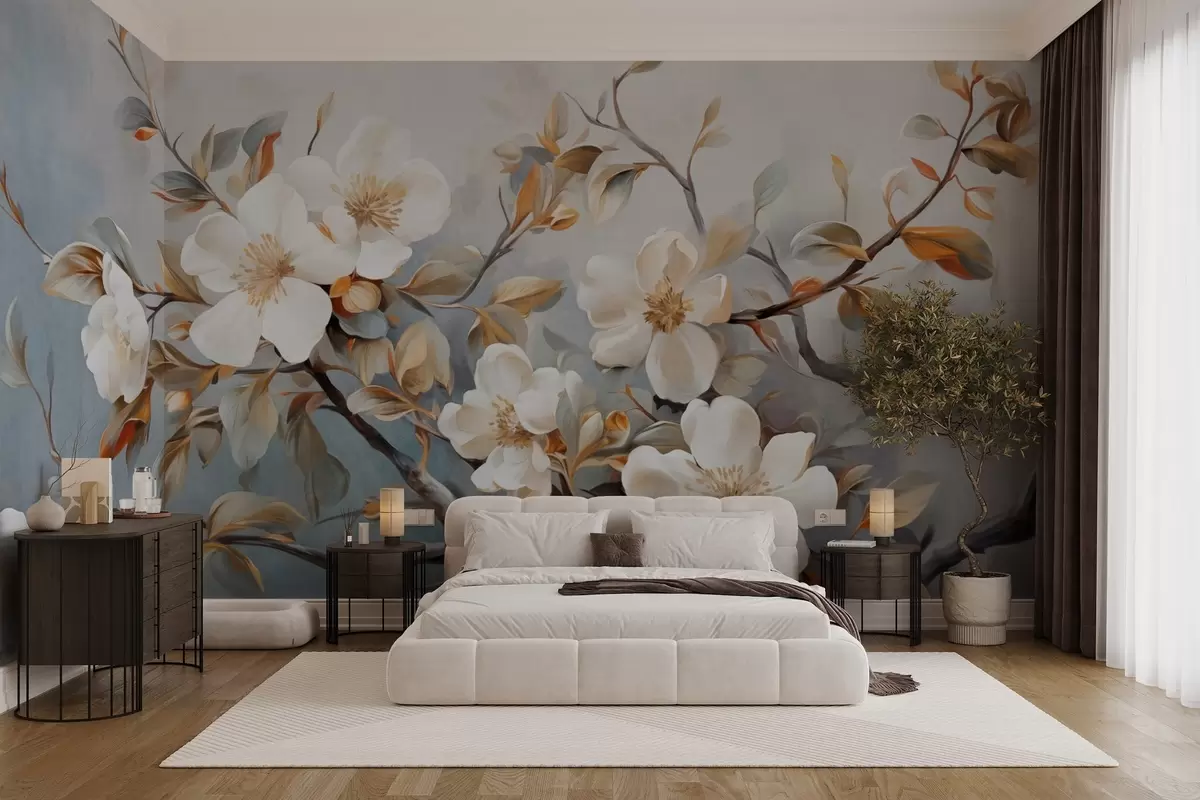 Fototapeta Białe kwiaty z żółtymi słupkami na gałęzi drzewa z liśćmi, jasne tło, styl vintage, teksturowany nadruk Nr w09368