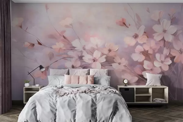 Fototapeta Kompozycja kwiatowa z delikatnymi kwiatami o miękkich, rozmytych krawędziach, na pastelowym tle w odcieniach lawendy i jasnego różu Nr w09369