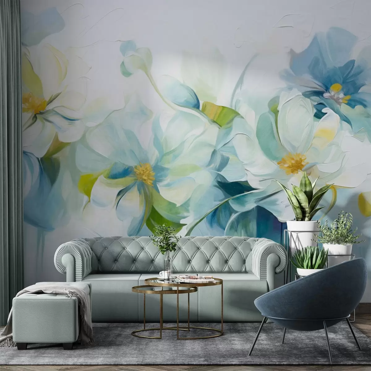 Fototapeta Abstrakcyjne białe i niebieskie kwiaty z żółtymi słupkami i zielonymi liśćmi, na białym tle, teksturowany styl malarski Nr w09372