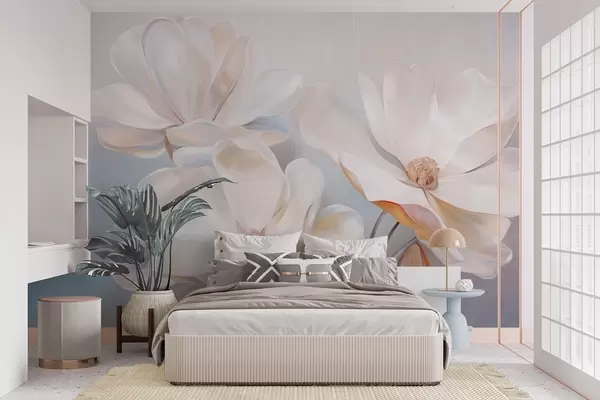 Fototapeta Białe, fantazyjne kwiaty magnolii o delikatnych, teksturowanych płatkach, na miękkim, abstrakcyjnym tle. Nr w09373