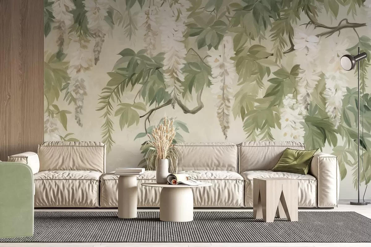 Fototapeta Gałęzie glicynii z białymi kwiatami i zielonymi liśćmi, zielone tło, teksturowany obraz w stylu vintage Nr w09375